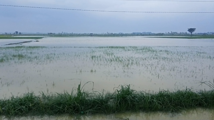Genangan air yang melingkupi sawah ini terjadi akibat luapan air hujan yang tidak mampu tertampung oleh sistem drainase dan saluran irigasi, mengancam keberlangsungan tanaman padi yang baru memasuki fase pertumbuhan awal.