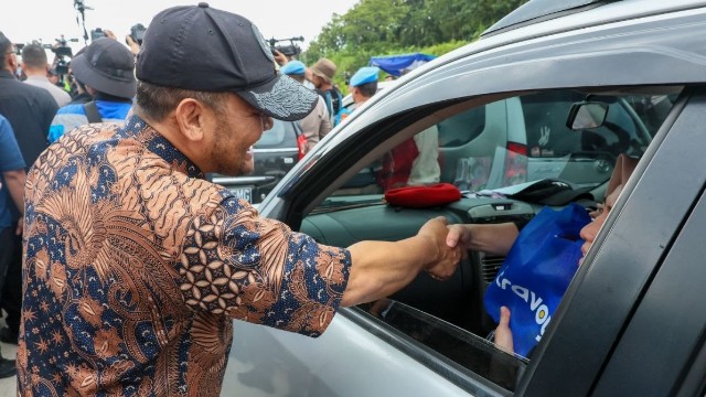 ONE WAY : Gubernur Jawa Tengah, Ahmad Luthfi menyalami pemudik saat membuka jalur satu arah arus balik Lebaran 2026 mulai dari Gerbang Tol (GT) Kalikangkung Semarang pada Selasa 24 Maret 2026. (Mondes/Dian).