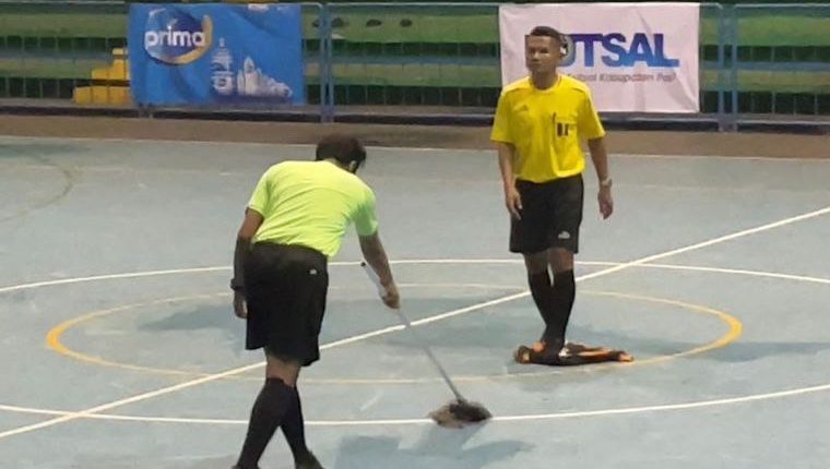 Pada videonya, wasit terlihat sedang membersihkan air di lantai GOR Pesantenan.