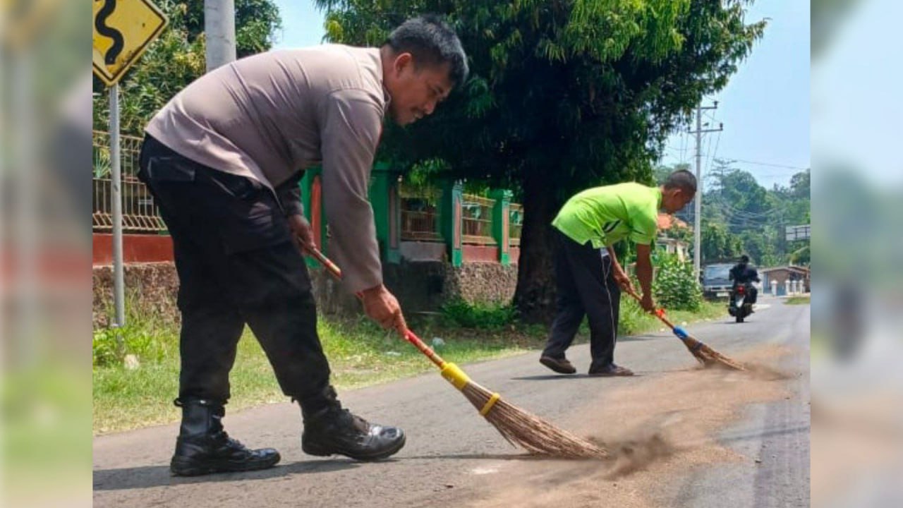 Anggota Bhabinkamtibmas Polsek Bangsri jajaran Polres Jepara Aipda Abidin, langsung membersihkan ceceran oli tersebut.