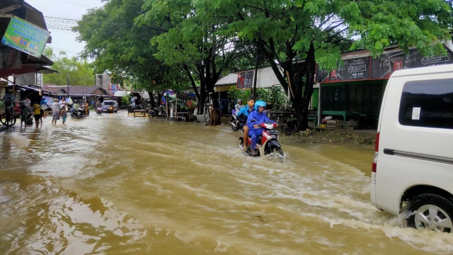 Disebabkan curah hujan yang tinggi dan debit air yang membludak, sehingga arus dari hulu ke hilir datang membanjiri ruas jalan dan permukiman penduduk.