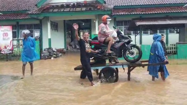 Untuk melintasi genangan air yang mencapai kedalaman hampir 1 meter, warga memanfaatkan ojek banjir.