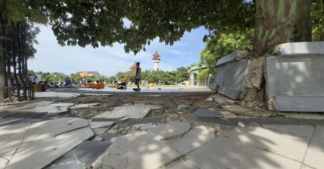 ​Hasil pemantauan di lapangan menunjukkan berbagai titik kerusakan struktural, meliputi lantai dasar yang tidak rata dan terekspos tanah, serta retakan pada pot-pot tanaman akibat perambatan akar pohon.
