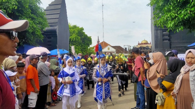 Ratusan pelajar dari tingkat TK, SD, hingga SMP juga ikut berbaris dalam rombongan kirab.