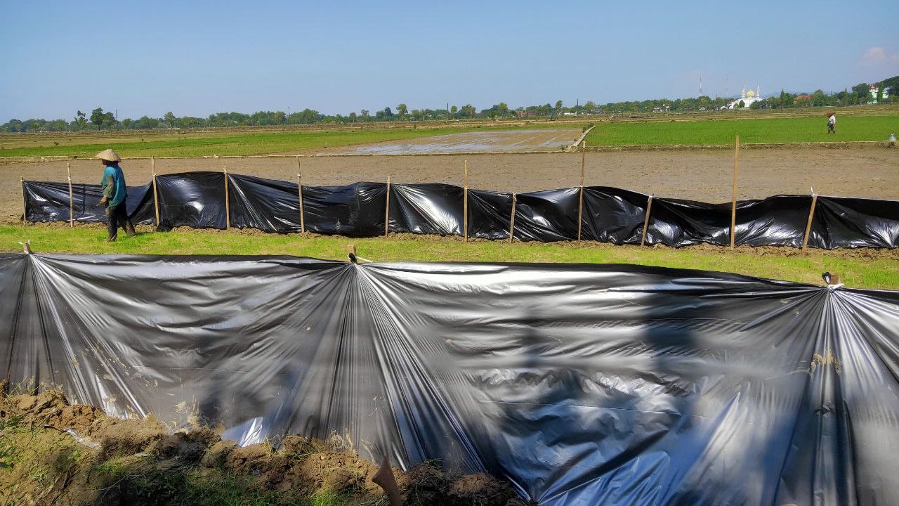 Plastik tebal itu dipasang mengelilingi area pembibitan di lahan sawahnya.