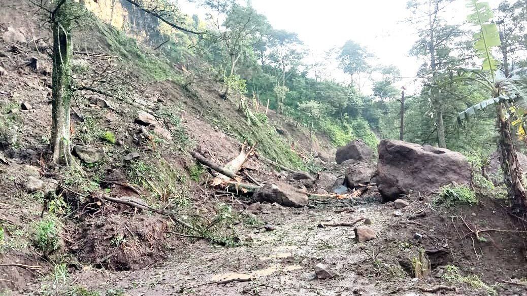 Berdasarkan hasil informasi dan asesmen di lokasi kejadian, material longsor menutup seluruh badan jalan.