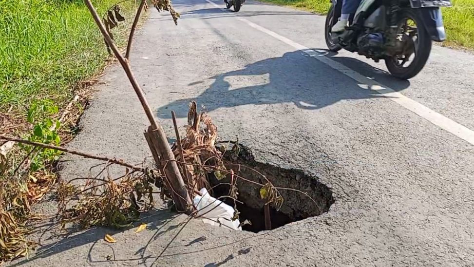 Salah satunya kondisi jalan yang memiliki lubang sedalam kurang lebih 1,5 meter, di Desa Tanjung, Kecamatan Sulang, Kabupaten Rembang.