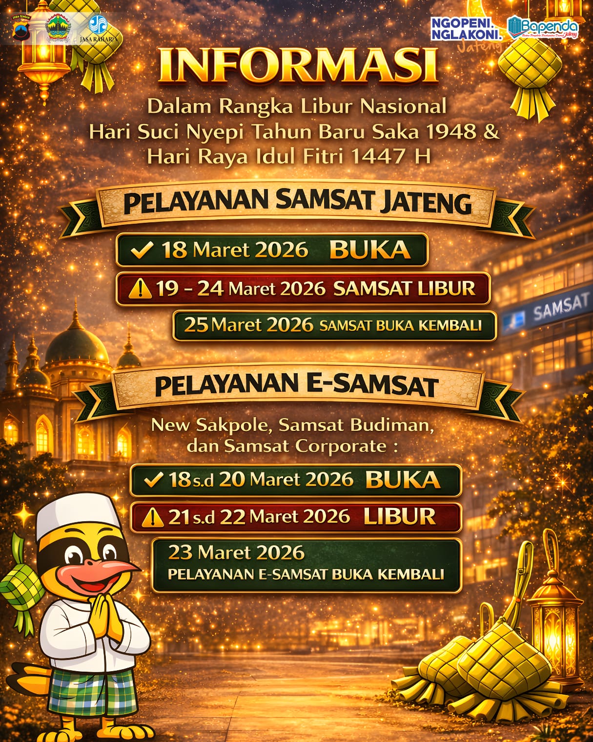 Layanan administrasi kendaraan akan libur pelayanan selama libur nasional dan cuti bersama Hari Raya Idul Fitri 1447 Hijriah.