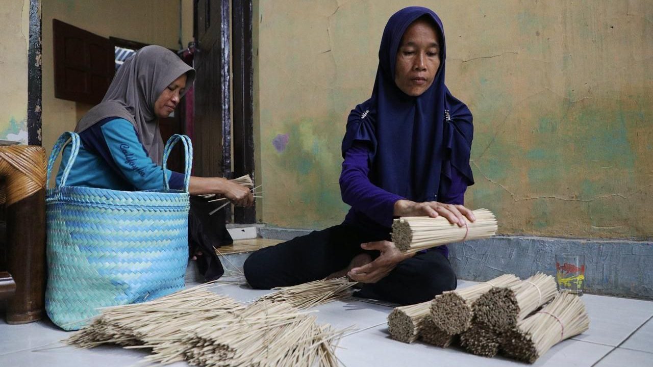 Kelompok Usaha Bersama (Kube) Mandiri Sejahtera yang terdiri dari sepuluh emak-emak, terlihat bersemangat memproduksi tusuk sate berbahan bambu.