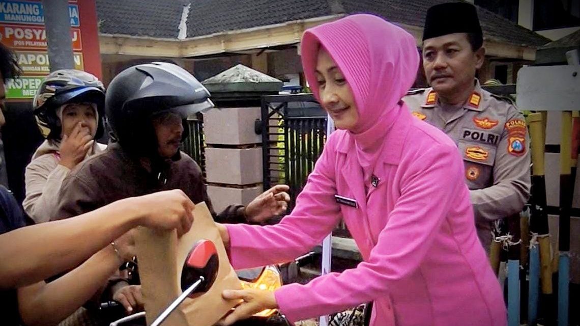 Foto; Dampingi Bhayangkari, Kapolsek Pogalan dan jajaran membagikan takjil kepada pengguna jalan (Mondes/Her) TRENGGALEK – Mondes.co.id | Memanfaatkan momentum keberkahan di Bulan Suci Ramadan, keluarga besar Polsek Pogalan berbagi ratusan paket takjil.