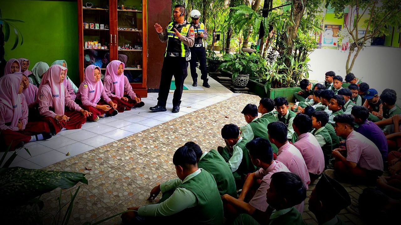 Foto: Anggota Unit Kamsel Satlantas Polres Trenggalek sedang memberikan edukasi kepada pelajar MTSN 2 Trenggalek (Mondes/Her) TRENGGALEK – Mondes.co.id | Libur panjang Natal dan Tahun Baru (Nataru) telah selesai, begitu pula dengan libur sekolah.