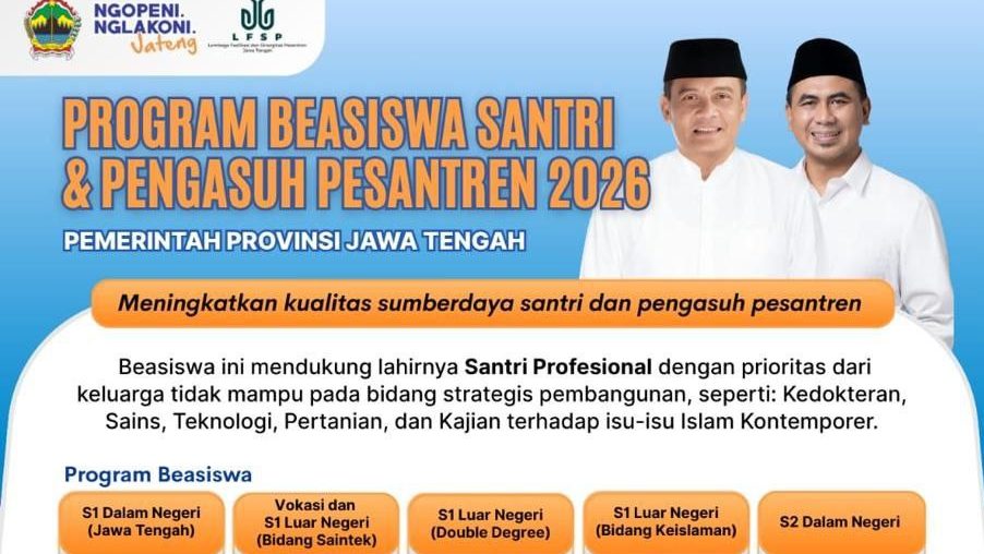Foto: Program beasiswa untuk santri Jateng (Mondes/Istimewa) SEMARANG – Mondes.co.id | Program beasiswa santri dan pengasuh pesantren tahun 2026 dari Gubernur Jateng Ahmad Luthfi dan Wakilnya Taj Yasin Maimoen (Gus Yasin) sudah mulai dibuka.