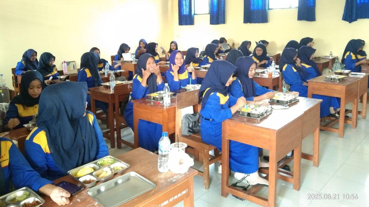 Foto: Suasana riang dan penuh syukur siswi SMK Al Falah Winong menikmati porsi MBG dari SPPG Winong 01 (Mondes/Harold)