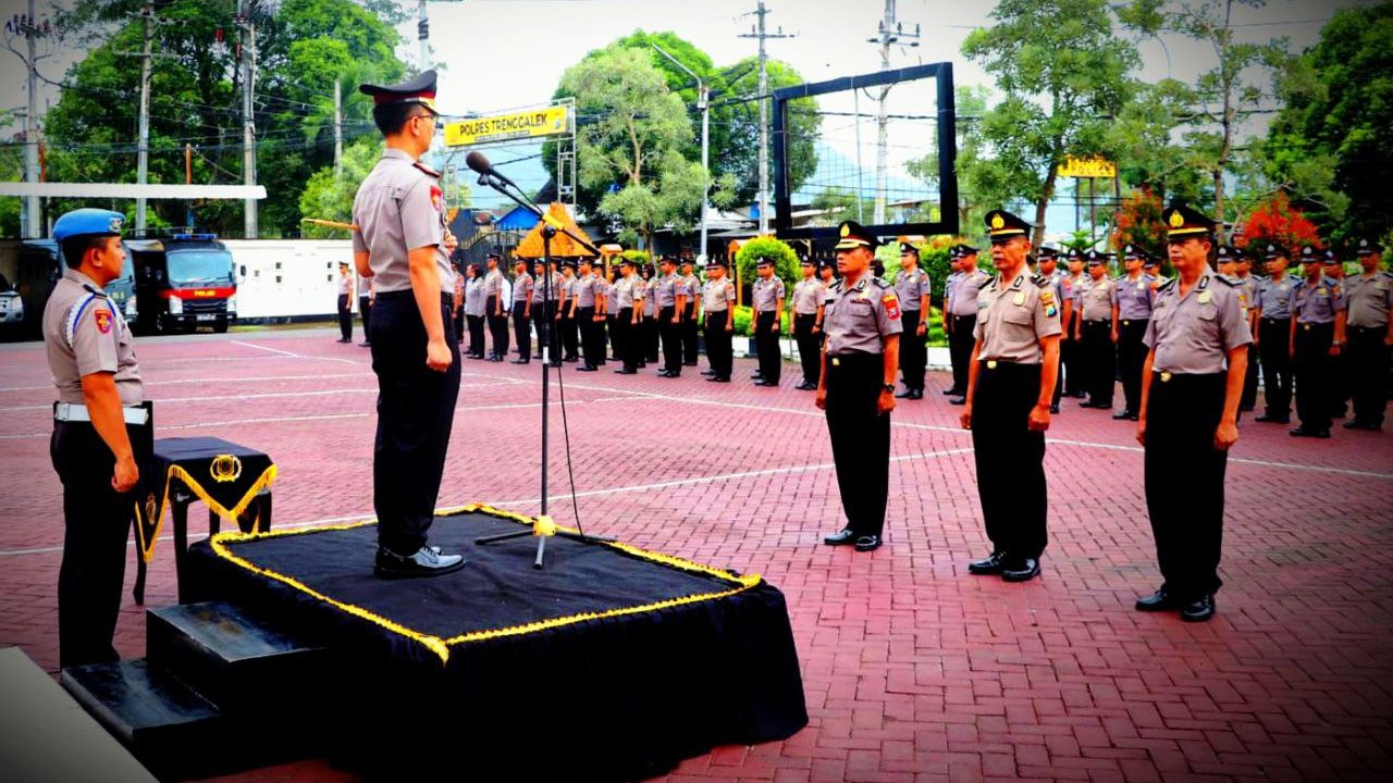 Prosesi korp raport kenaikan pangkat dipimpin langsung Kapolres Trenggalek, AKBP Ridwan Maliki di halaman Mapolres pada Senin, 2 Maret 2026.
