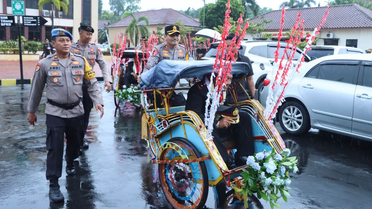 Iring-iringan becak hias anggota Polri yang purna tugas dan dikayuh Kapolres, Wakapolres, perwira dan Bhayangkari ini disambut lambaian tangan anggota yang mengantarkannya ke pintu gerbang Mapolres.