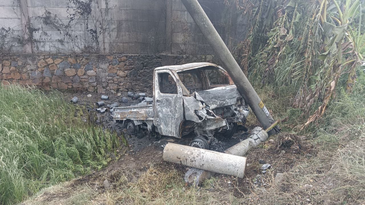 Setelah menabrak tiang listrik hingga patah, kemudian mobil memercikan api dan langsung membakar kendaraan bak terbuka itu.
