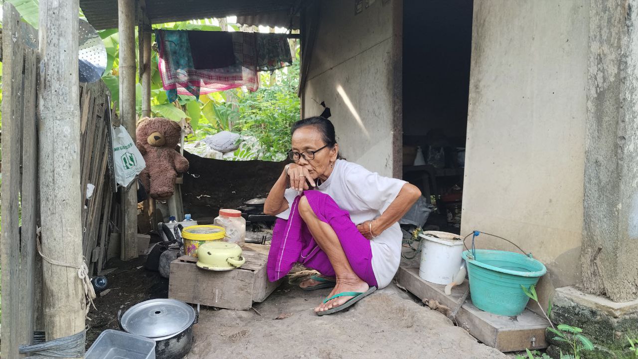 Dalam kondisi sebatang kara, ia hidup mengandalkan uluran tangan tetangga dan tinggal di gubuk sangat sederhana.