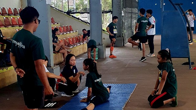 ASESMEN: Atlet gymnastic saat menjalani tes fisik di Lapangan Tenis Komplek Stadion Joyo Kusumo Pati pada Minggu 21 Desember 2025.