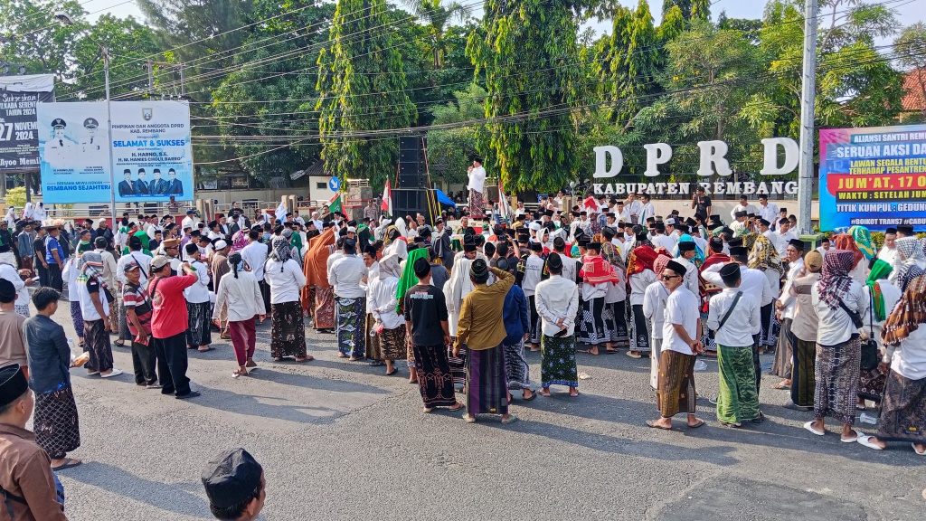 Para santri yang tergabung dalam Aliansi Santri Rembang Bersatu (ASRB), menggelar aksi damai akbar di depan Gedung Dewan Perwakilan Rakyat Daerah (DPRD) Rembang pada Jumat, 17 Oktober 2025.