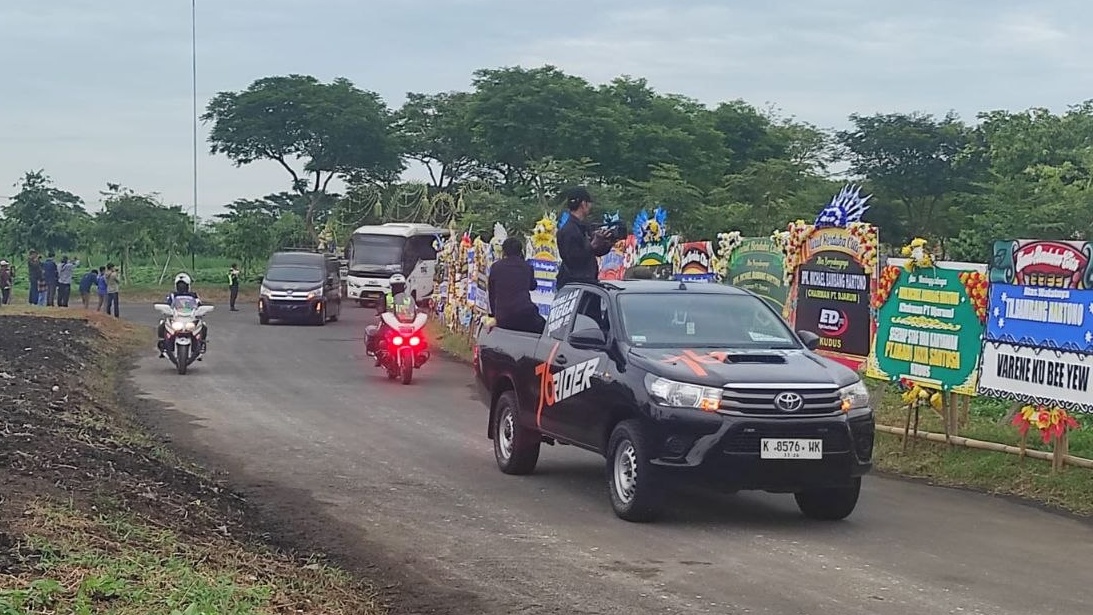 Setidaknya 10 bus rombongan pelayat yang terdiri dari pihak keluarga, direksi perusahaan, dan tamu undangan terpantau memasuki area pemakaman.