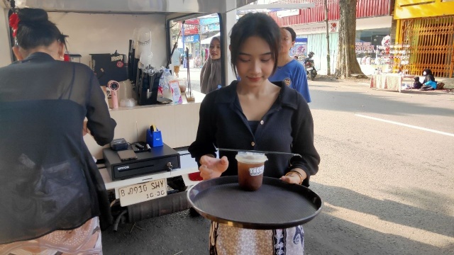 “Pakai pakaian kebaya karena ada edaran dari pemerintah untuk mengenakan pakaian adat di CFD hari ini,” ucapnya sambil meracik kopi.