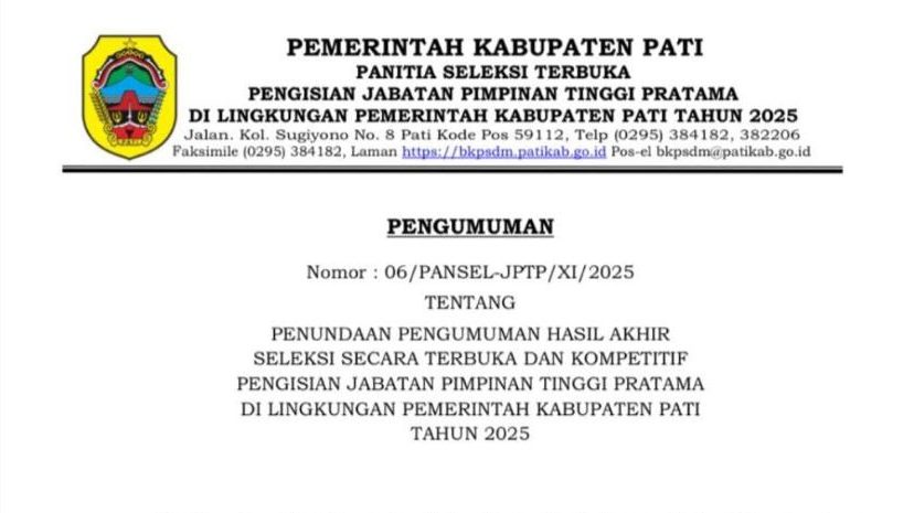 Kepastian itu dituangkan dalam surat pengumuman yang bernomor 06/PANSEL-JPTP/XI/2025 tentang Penundaan Pengumuman Hasil Akhir Seleksi Secara Terbuka dan Kompetitif Pengisian JPTP di Lingkungan Pemkab Pati tahun 2025.