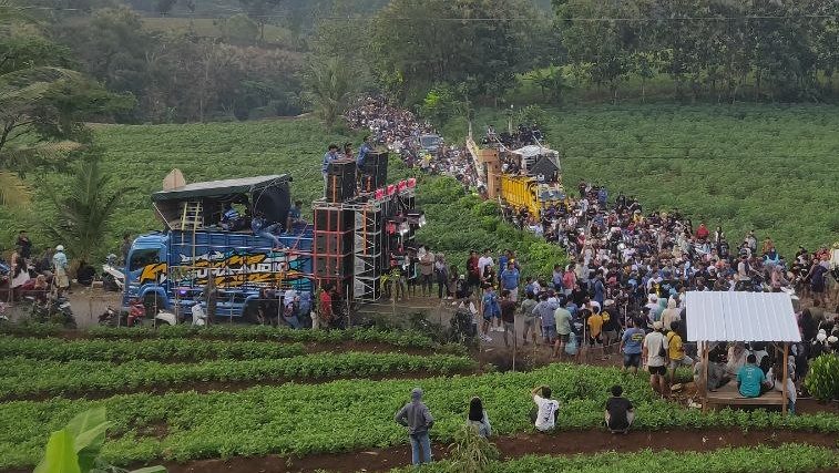 Foto: Suasana sound horeg pentas di Desa Cabak (Mondes/Singgih) PATI – Mondes.co.id | Sejumlah video menunjukkan truk bermuatan sound horeg di Kabupaten Pati tak kuat melewati tanjakan, viral di jagat maya.