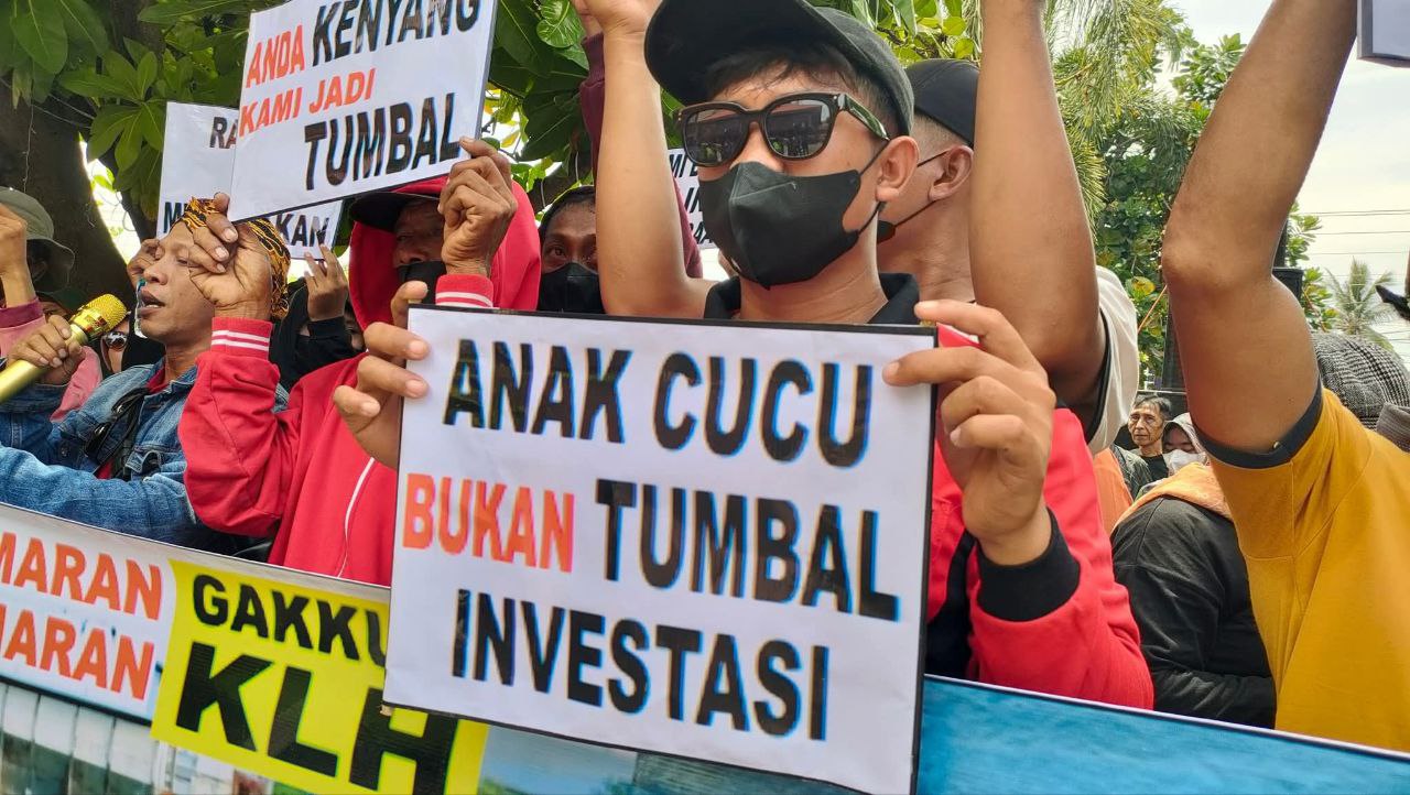 “Kita desak tutup sementara, sampai mereka nggak mencemari lingkungan lagi,” tegas Afif, sambil menunjukkan poster “ANAK CUCU BUKAN TUMBAL INVESTASI”.