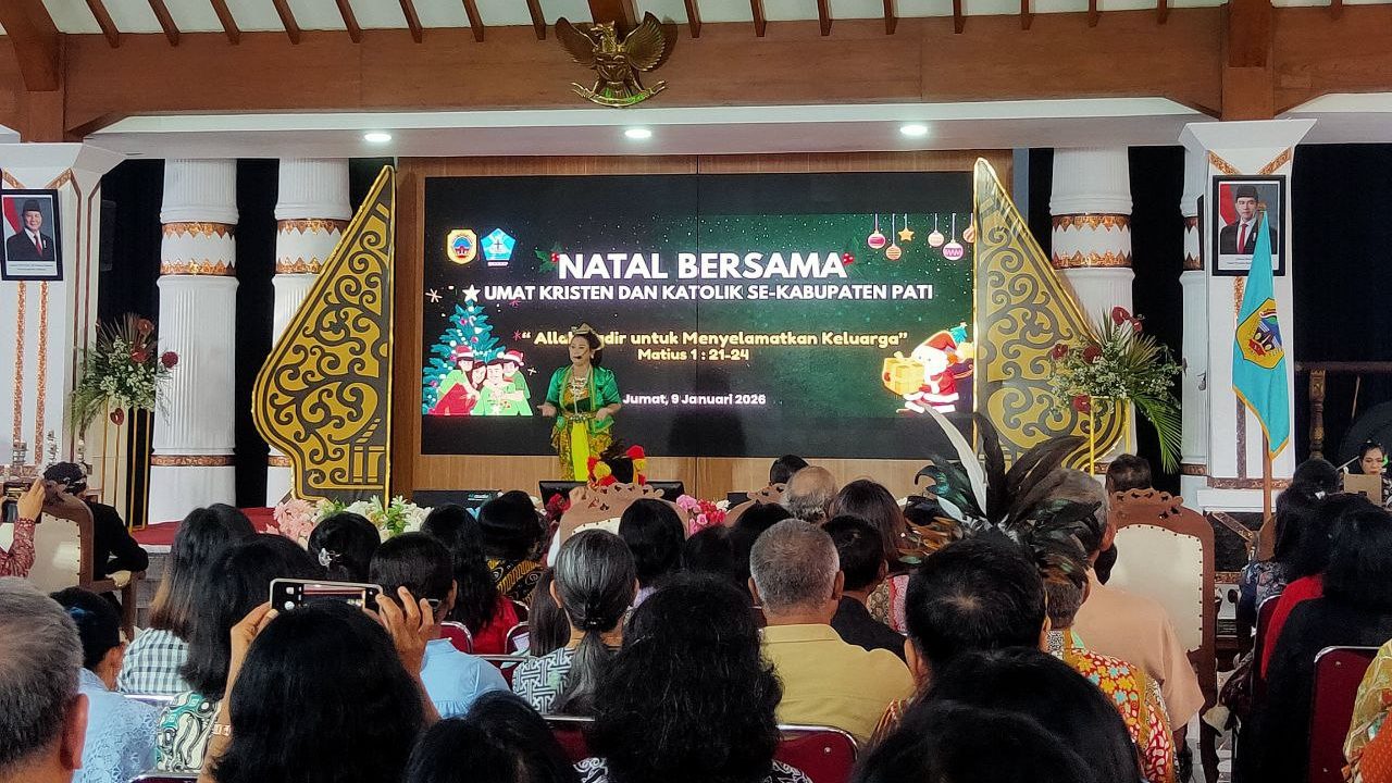 Foto: Perayaan Natal Bersama di Pendopo Kabupaten Pati (Mondes/Singgih) PATI – Mondes.co.id | Pemerintah Kabupaten (Pemkab) Pati bersama Badan Kerjasama Kristen dan Katolik Kabupaten Pati (BKKKKP) menggelar puncak perayaan Natal bersama di Pendopo Kantor Bupati Pati, Jumat, 9 Januari 2026.