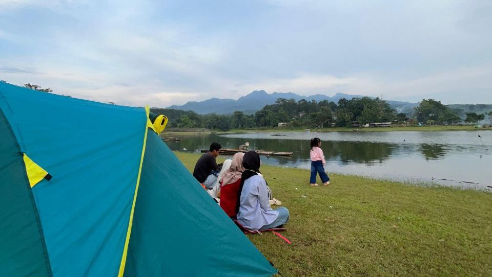 Memanfaatkan tepi waduk yang luas, Diana bersama keluarga mendirikan tenda untuk bermalam mengabiskan waktu bersama.
