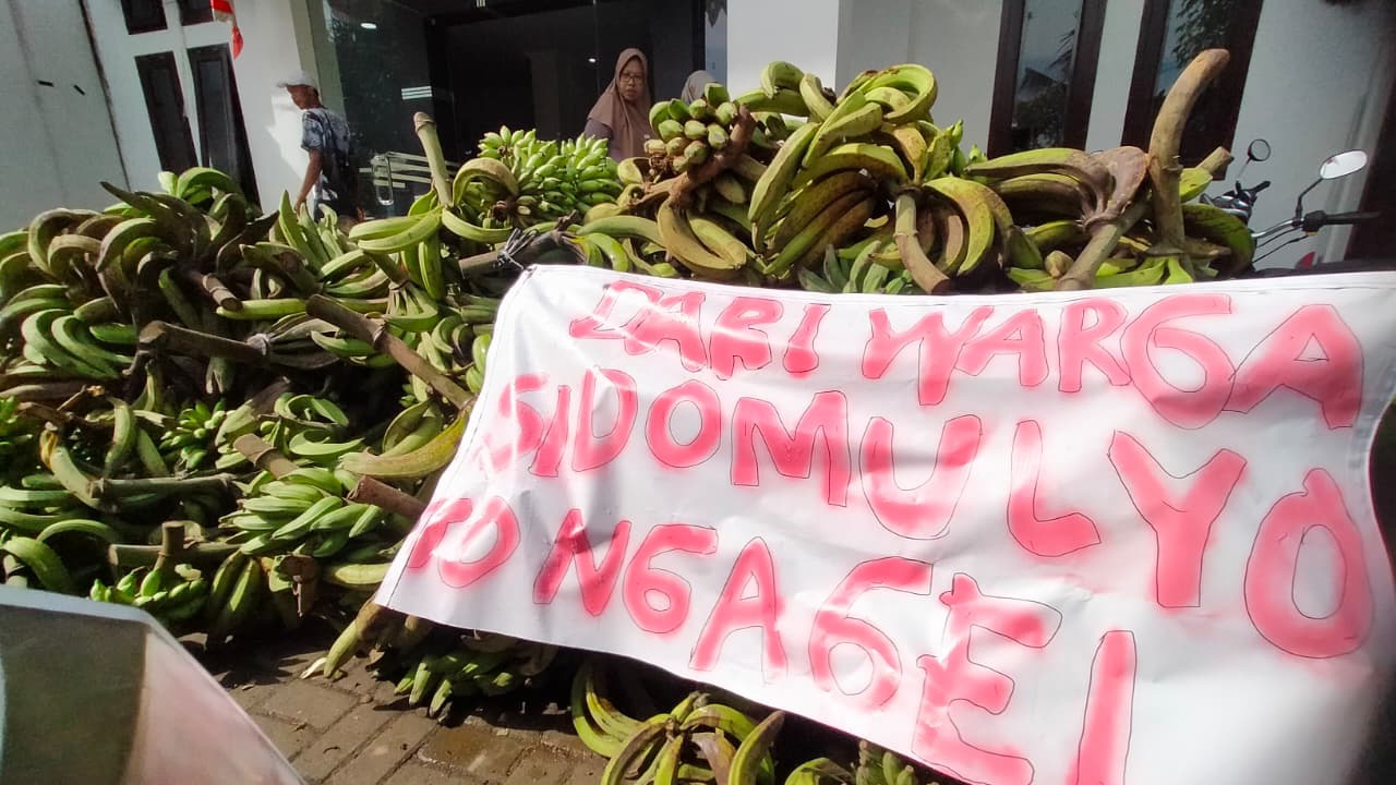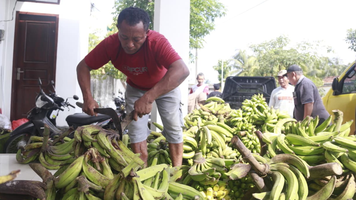 Saking banyaknya, puluhan tandan pisang tanduk, alpukat, nanas hingga singkong mentega, diantar sendiri oleh Kepala Desa Sidomulyo, Giyanto dengan menggunakan dua kendaraan bak terbuka.
