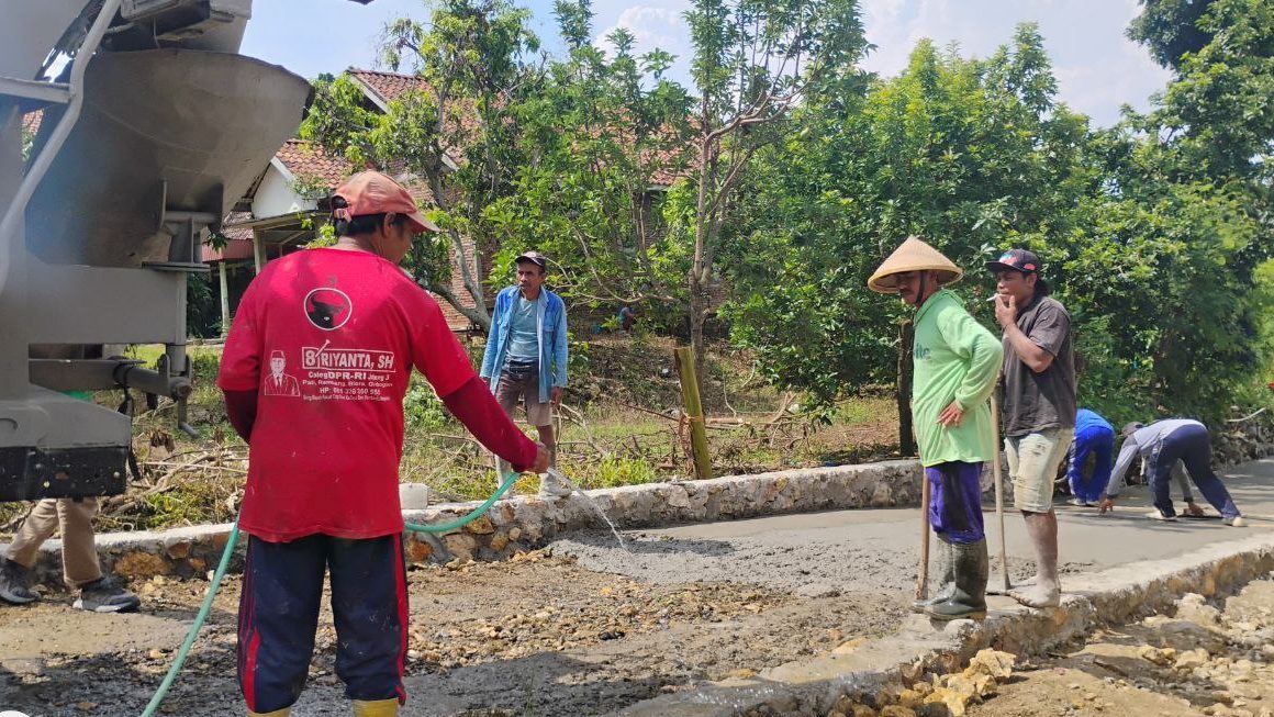 Foto: Rustam bersama warga Wukirsari sedang mengerjakan pengecoran ruas jalan (Mondes/Singgih)